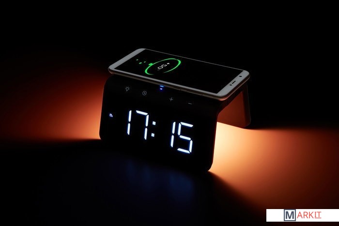Быстрая беспроводная зарядка с часами-будильником и ночником – стильное, современное и многофункциональное устройство, совмещающее в себе функции беспроводной зарядки и часов с будильником. Корпус из софт-пластика приятен не только на ощупь, но и визуально.УДОБНО:Модель оборудована цифровым дисплеем с хорошо различимыми символами и трехуровневой регулировкой яркости экрана. Наличие LED ночника белого цвета с тремя режимами яркости, который при необходимости можно включить/выключить. Наличие RGB подсветки (7 цветов). Стильно выполненные подсвечивающиеся сенсорные кнопки управления на лицевой панели. А также наличие дополнительно разъема USB для зарядки других устройств (5V 1A). ЗАРЯДКА МОБИЛЬНЫХ УСТРОЙСТВ:Избавьтесь от лишних проводов, просто положив свой девайс на плоскую панель устройства, если он поддерживает беспроводной стандарт Qi.ЧТОБЫ НЕ ПРОСПАТЬ:Установите два будильника, которые помогут проснуться утром именно тогда, когда нужно и не опоздать на работу или важную встречу.Требуется адаптер питания стандарта QC 2.0 и выше (в комплект не входит).